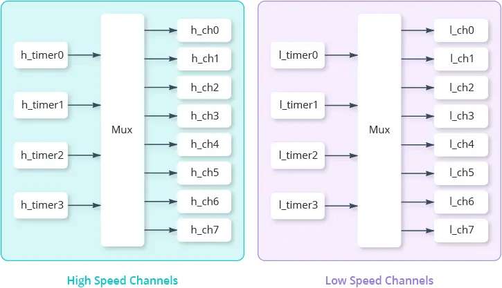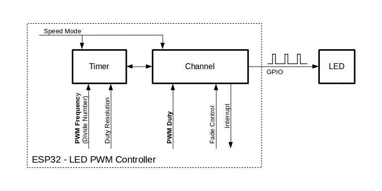 PWM Channels Now let us turn our attention to the concept of a channel. A channel represents a unique PWM output signal. Within each group, there are 4 timers shared among 8 channels, which means that every two channels share the same timer. Since the timer determines the frequency, it’s important to understand that we cannot adjust the frequency of each channel independently within a pair. However, we can control the PWM duty cycle of each channel independently. The ESP32 can generate a PWM signal with a frequency of up to 40 MHz, and the PWM resolution can be adjusted from 1 to 16 bits. But this doesn’t mean you can set a frequency of 40 MHz and a resolution of 16 bits at the same time. This is due to the fact that the maximum PWM frequency and resolution are both bound by the clock source. #include <stdio.h> #include "driver/ledc.h" #include "esp_err.h" #define TIMER_USED LEDC_TIMER_0 // LEDC_TIMER_0 .. LEDC_TIMER_3 #define RESOLUTION_USED LEDC_TIMER_4_BIT // LEDC_TIMER_1_BIT .. LEDC_TIMER_20_BIT #define PWM_CHANNEL_USED LEDC_CHANNEL_0 // LEDC_CHANNEL_0 .. LEDC_CHANNEL_7 #define PWM_GPIO_PIN_USED 17 static void IDF_ledc_set_frequency( uint32_t IN_freq_hz ) { //After that, MAX_DUTY_CYCLE is calculated using the formula 2^PWM_RESOLUTION−1. //This value determines the maximum achievable duty cycle based on the chosen resolution. const int MAX_DUTY_CYCLE = (int)(pow(2, RESOLUTION_USED) - 1); // Prepare and then apply the LEDC PWM timer configuration ledc_timer_config_t ledc_timer; memset( &ledc_timer, 0, sizeof(ledc_timer_config_t)); ledc_timer.speed_mode = LEDC_HIGH_SPEED_MODE; ledc_timer.timer_num = (ledc_timer_t) TIMER_USED; // LEDC_TIMER_0, LEDC_TIMER_1, LEDC_TIMER_2, LEDC_TIMER_3 ledc_timer.duty_resolution = (ledc_timer_bit_t) RESOLUTION_USED; // for (LEDC_TIMER_4_BIT) duty values are 0..15 (8=50/50%) ledc_timer.freq_hz = IN_freq_hz; // set output frequency //ledc_timer.clk_cfg = LEDC_APB_CLK; // somehow missing in Arduino framework ledc_timer_config( &ledc_timer ); // Prepare and then apply the LEDC PWM channel configuration ledc_channel_config_t ledc_channel; memset( &ledc_channel, 0, sizeof(ledc_channel_config_t)); ledc_channel.speed_mode = LEDC_HIGH_SPEED_MODE; ledc_channel.channel = (ledc_channel_t) PWM_CHANNEL_USED; // LEDC_CHANNEL_0 .. LEDC_CHANNEL_7 ledc_channel.timer_sel = (ledc_timer_t) TIMER_USED ; // LEDC_TIMER_0 .. LEDC_TIMER_3 ledc_channel.intr_type = LEDC_INTR_DISABLE; ledc_channel.gpio_num = PWM_GPIO_PIN_USED; ledc_channel.duty = MAX_DUTY_CYCLE/2+1; // for (LEDC_TIMER_4_BIT) duty values are 0..15 (8=50/50%) ledc_channel.hpoint = 0; ledc_channel_config( &ledc_channel ); }