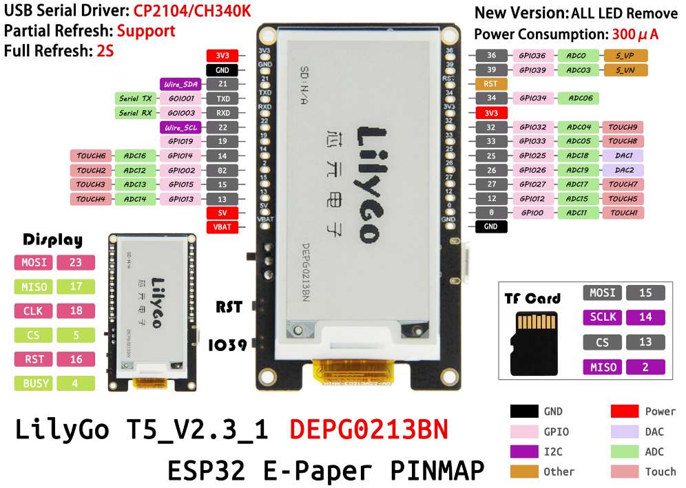 - LCD (0.96 inch) TFT 160x80 SPI (GPIO 5,13,15,18,23 + Backlight_LDO2 + Logic_LDO3)
