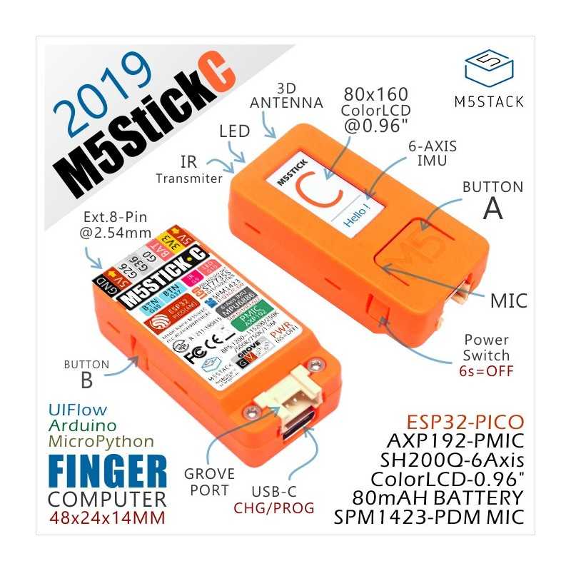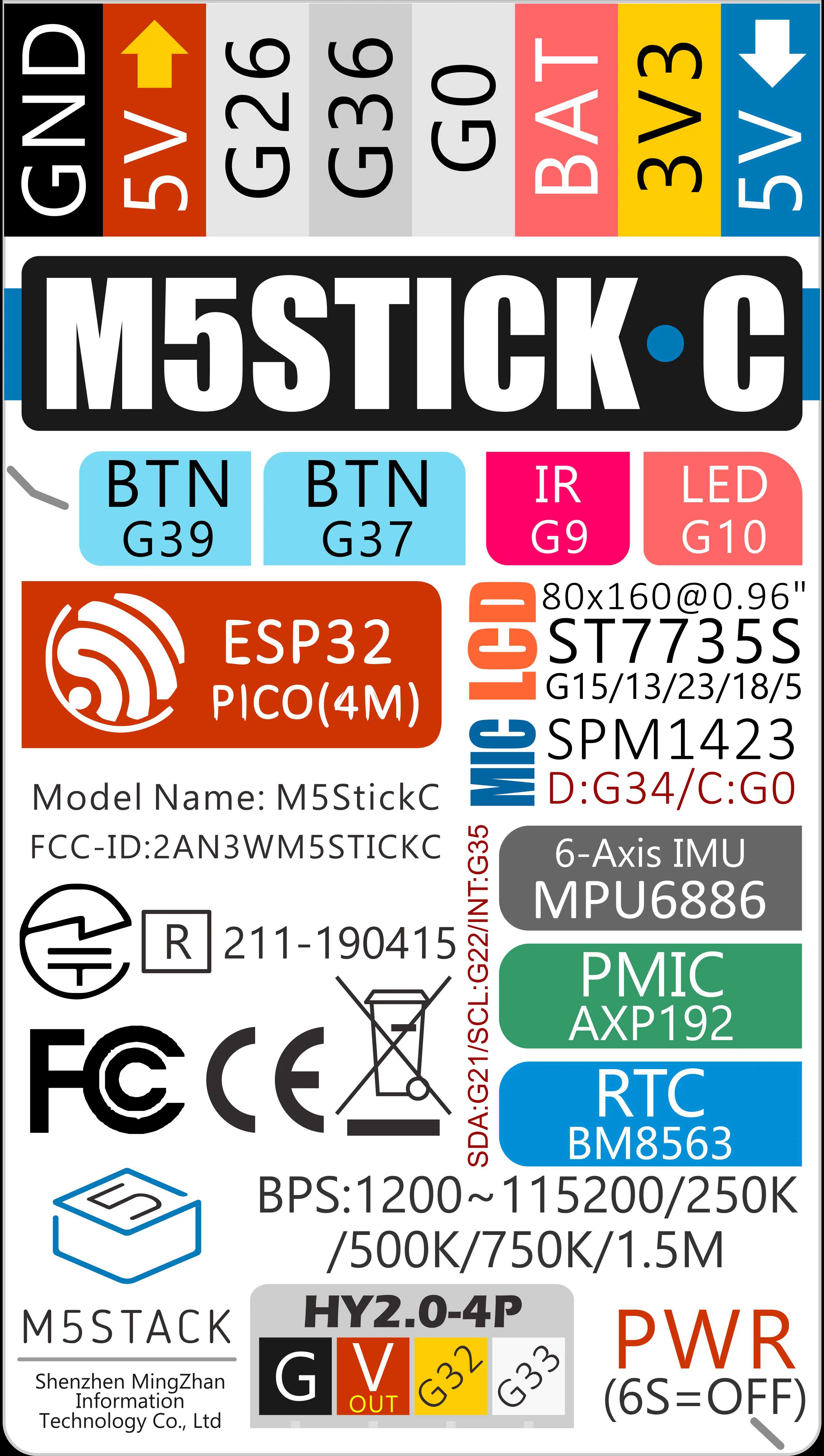 - 6-Axis IMU MPU6886 (I2C+IRQ, AXP-VESP_3V3)
