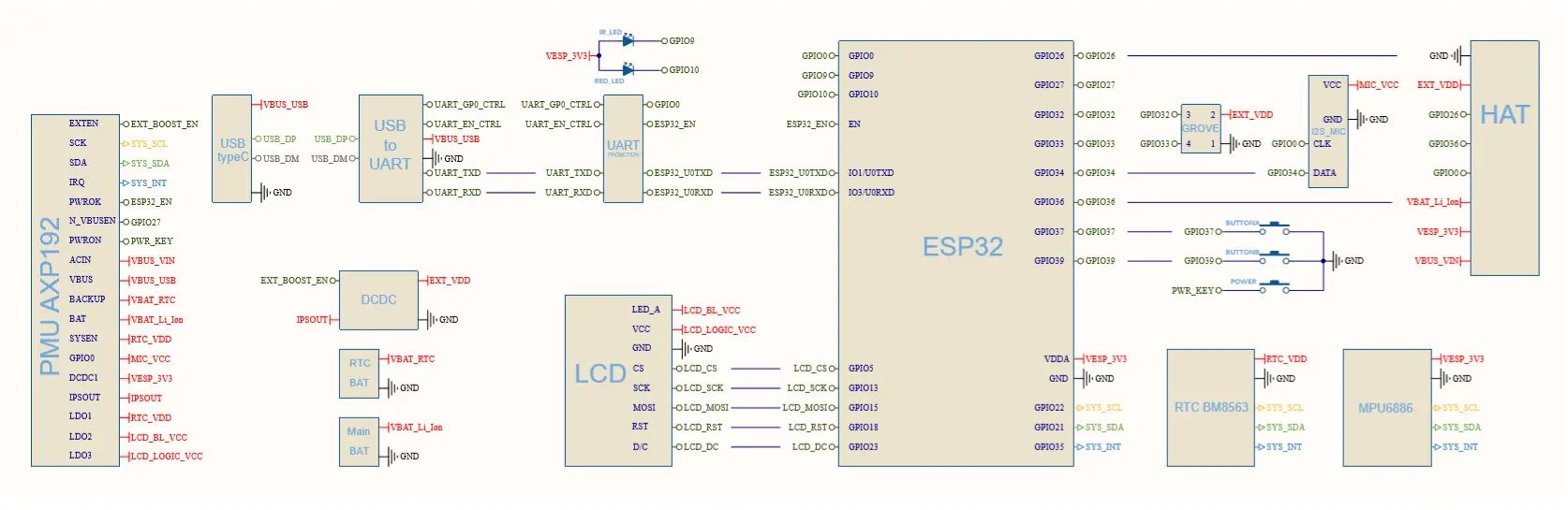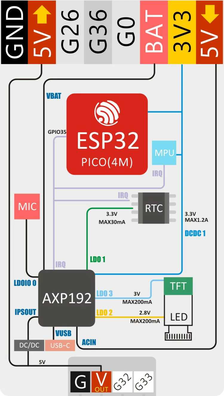 - PMU AXP192 (I2C+IRQ)