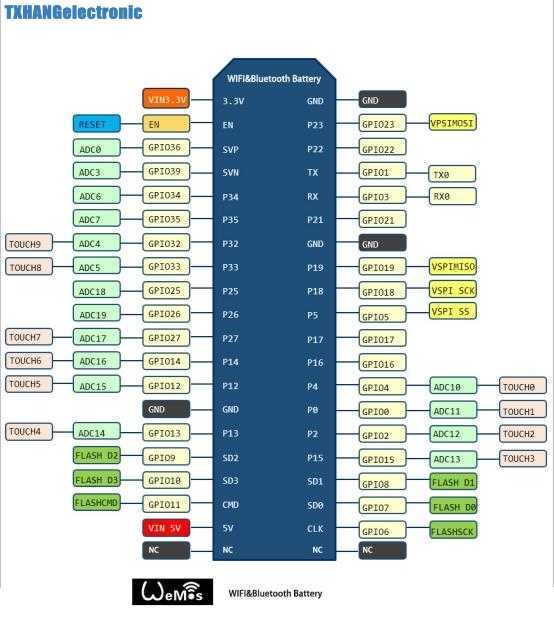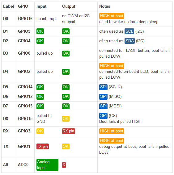 - GPIO12 (MTDI) = If driven High, flash voltage (VDD_SDIO) is 1.8V not default 3.3V. Has internal pull-down, so unconnected = Low = 3.3V. May prevent flashing and/or booting if 3.3V flash is used and this pin is pulled high, causing the flash to brownout. See the ESP32 datasheet for more details.