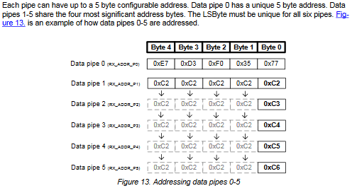 - The 6 pipes allow an nRF24 to listen for messages from 6 other devices with 6 different addresses. But those devices may not transmit at the exact same time.